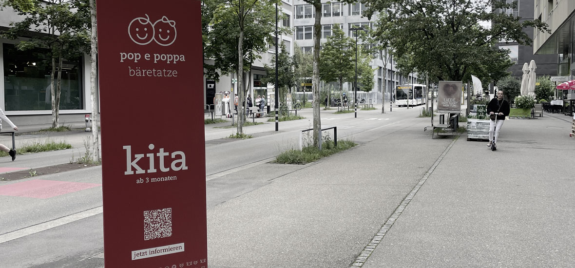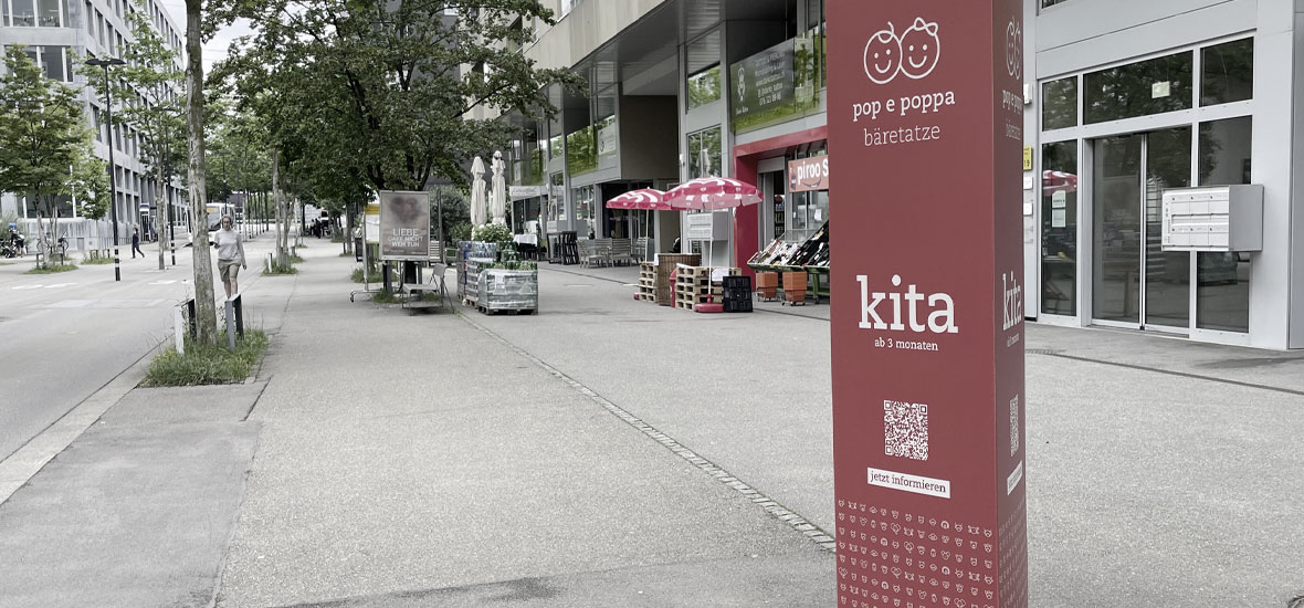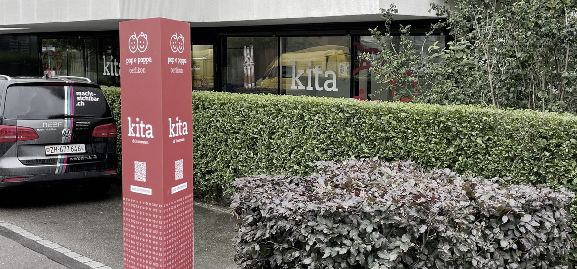 Für die schweizweit tätige Kita-Organisation pop e poppa bringen wir Sichtbarkeit mit Stil. Individuelle Gebäudebeschriftungen und klare Signaletik sorgen für Orientierung, während massgeschneiderte Sicht- und Sonnenschutzfolien je nach Standort für die richtige Balance aus Privatsphäre und Wohlfühlatmosphäre sorgen. darüber hinaus werden gewisse standorte mit den von naef entwickelten werbepylonen ausgestattet, wetterfest und vielseitig sichtbar.