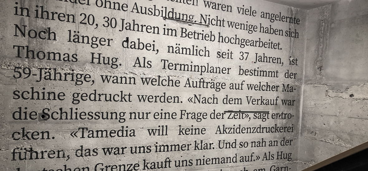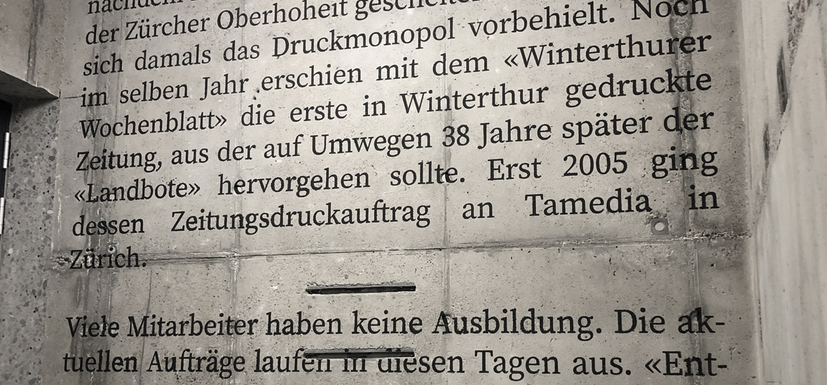 Über vier Etagen erzählt das Treppenhaus des Einkaufszentrums «Zur alten Druckerei» in Winterthur eine beeindruckende Geschichte: Die Rückwände zieren einen überdimensionalen Zeitungsartikel – ein emotionaler Blickfang und eine Hommage an die letzte gedruckte Ausgabe des «Landboten» aus genau diesem Gebäude. Die Idee dazu lieferte das Architekturbüro Nagel, das die reiche Tradition der Ziegler Druckerei in Szene setzen wollte. Heute erinnert das kunstvoll gestaltete Treppenhaus, entstanden im ehemaligen Liftschacht, an die glorreichen Tage des Zeitungsdrucks. Ein kreatives Denkmal, das Geschichte lebendig macht!