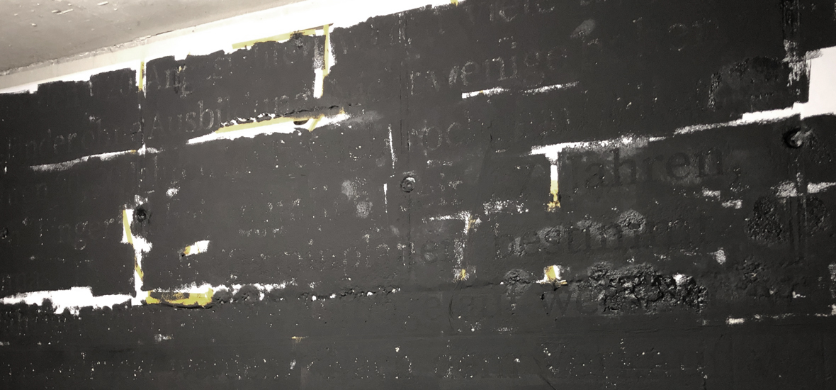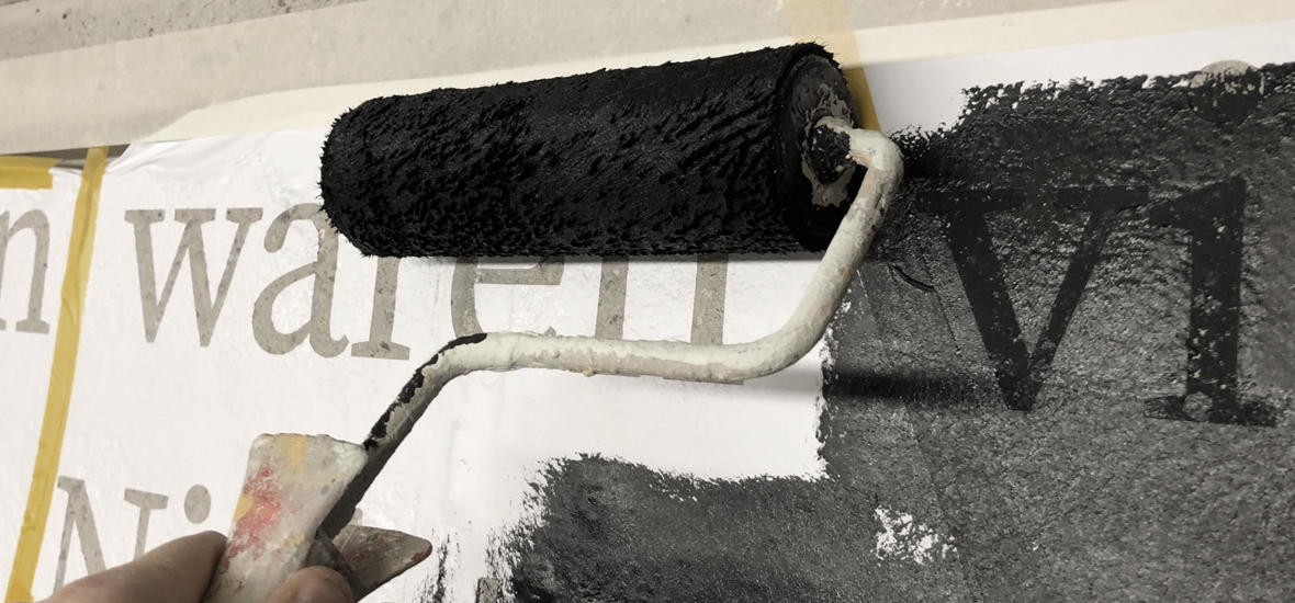 in einem zweiten schritt wurden die nicht beklebten flächen mit schwarzer matter farbe eingefärbt. im nachgang mussten die folienschablonen und alle buchstaben innenräume wieder entfernt werden. als letzter arbeitsgang mussten unsauberkeiten mit einem feinen pinsel retouchiert werden.