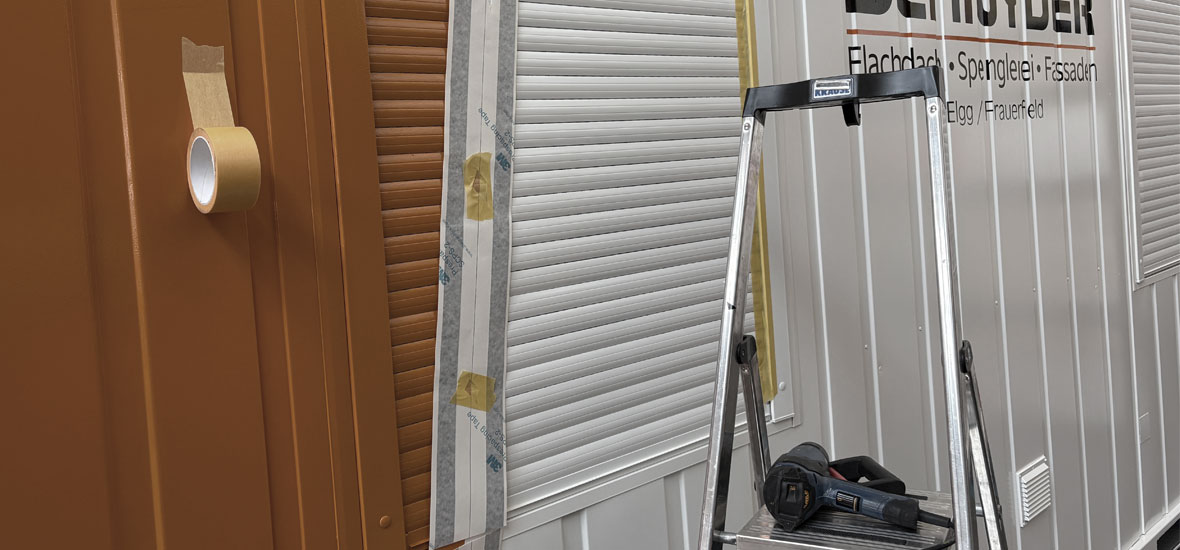 Der einst hellgrau-blaue Container bekam nach unseren Vorgaben vom Maler ein frisches Farbkleid in Orange und Weiss. damit die flächen und winkel stimmig auf den container übertragen werden konnten wurde eine detailierte vermassung erstellt. Der Maler hat ganze Arbeit geleistet und einen makellosen Job abgeliefert – die ideale Basis für eine präzise und wirkungsvolle Beschriftung!